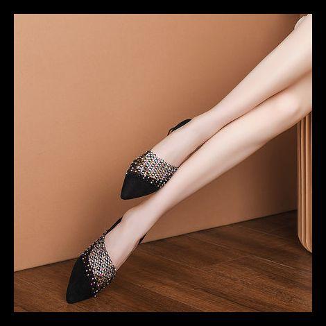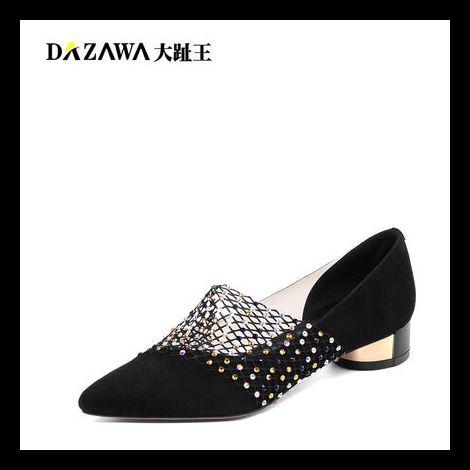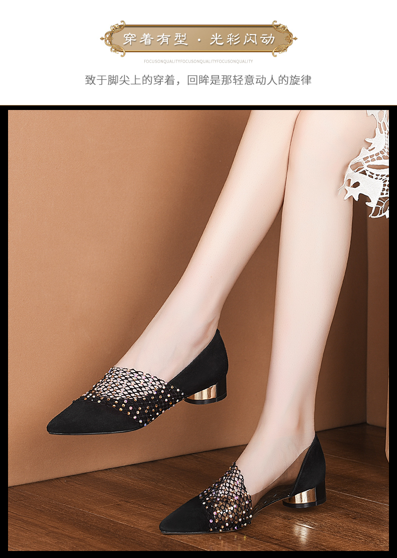 真皮单鞋女2020春季新款女鞋水钻镂空粗跟浅口鞋低跟时尚尖头大码